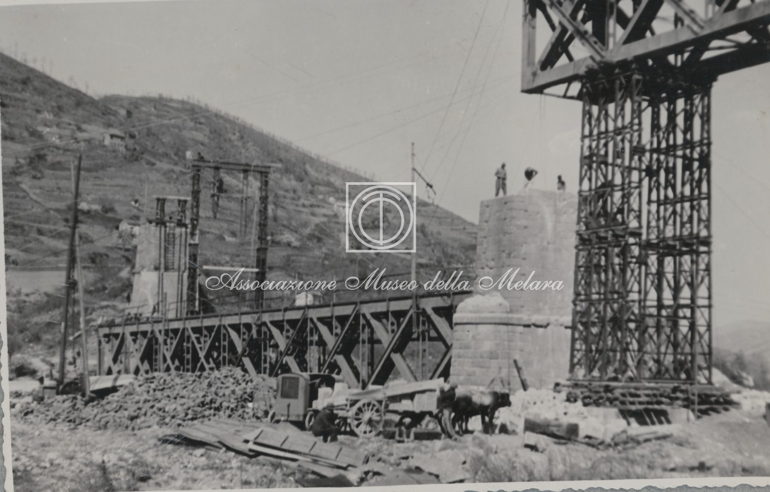 La Va pila in riparazione - La VIa travata in basso in corso di montaggio - le apparecchiature per il sollevamento della VIIa travata