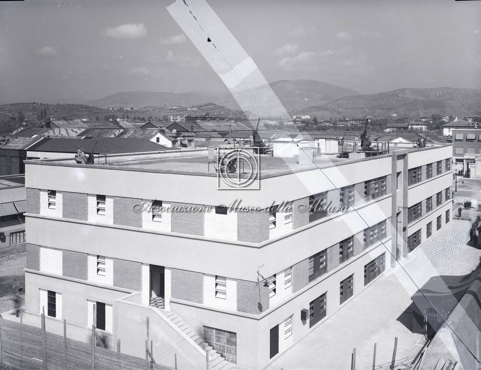 Media with "Is Part Of: Prove di difesa contraerea sul tetto - Veduta della palazzina"
